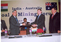 SCCL entered into Relationship arrangement with CSIRO, Australia on 01.02.2006 at New Delhi. This arrangement facilitates R & D projects in Strata Mechanics, ventilation and other related subjects with specific reference to Longwall Mining. Sri R.H.Khwaja, IAS, C & MD, SCCL and Dr. Cliff Mallett, Acting Chief, CSIRO exchanged the relationship arrangement. Mr. Bob Baldwin, Parliamentary Secretary to Australia is also present. |