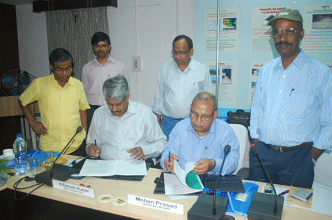 | SCCL entered into MOU on 11.07.2013 with Central Institute of Mining and Fuel Research (CIMFR) at Dhanbad to avail the technical services including monitoring and study of method of working, strata management, spontaneous heating and subsidence related activities on 24x7 basis. On this occasion, Shri Sutirtha Bhattacharya, IAS Chairman & Managing Director SCCL, Shri Rahul Guha, Director General of Mines safety and Dr..Amalendu Sinha Director CIMFR, Shri B.Ramesh Kumar Director (Operations) SCCL and Mr.Mohan Prasad, Chief Scientist, CIMFR were present.. The MOU likely to result in close collaboration in execution of Adriyala Longwall Project in SCCL with attended benefits of uninterrupted safe Coal Production. |