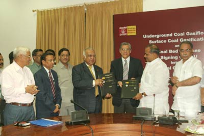 | SCCL and ONGC have signed a Memorandum of Understanding (MoU) to Cooperate in the Research and Development related to Underground Coal Gasification (UCG), Surface Coal Gassification(SCG) and Coal Bed Methane on Dt.15th April , 2006 at Hyderabad in the presence of Shri Y.S. Rajasekhara Reddy , Honourable Chief Minister of Andhrapradesh. |
