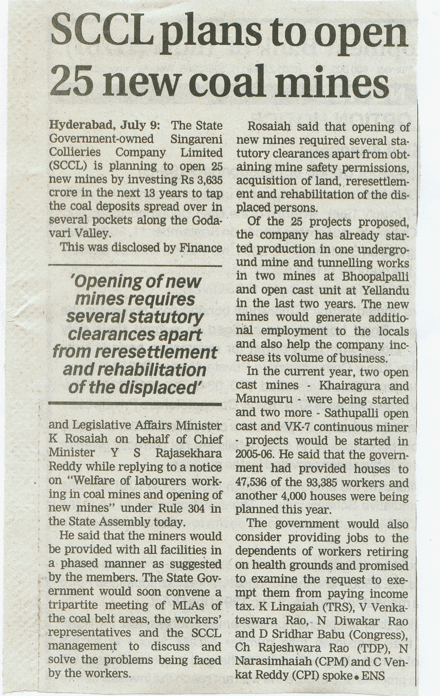 SCCL plans to open 25 New Coal Mines......July 9th, 2004