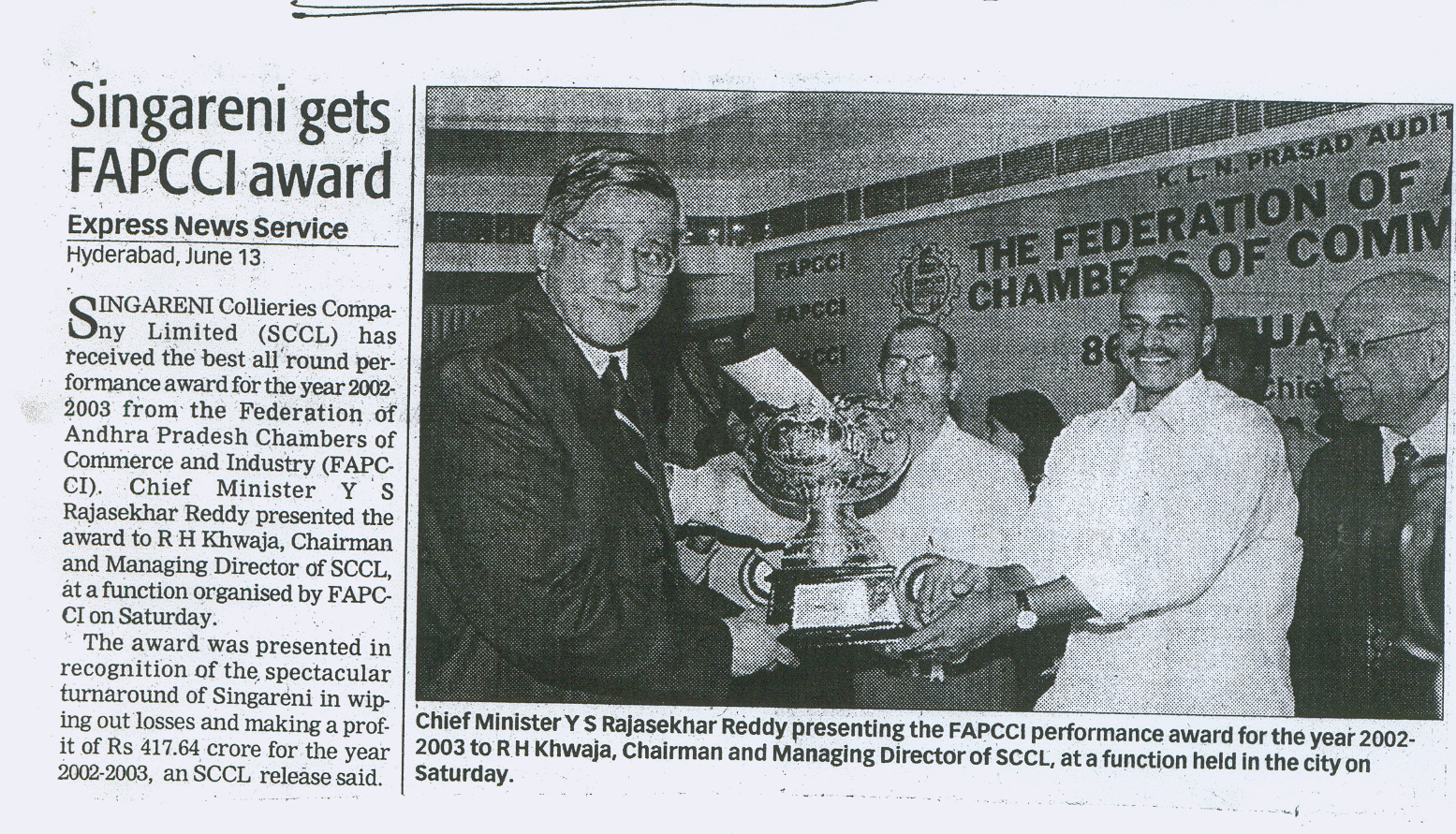 SCCL wins FAPCCI award for the year 2002 - 2003 ..... June 13,2004