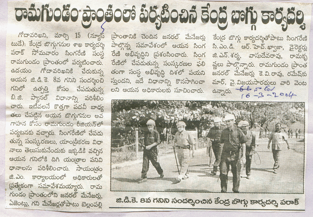 Secretary Ministry of Coal Government of India ,Sri P.C.Parakh visited GDK-8 Incline of Ramagundam Region ,SCCL on 15.3.2004